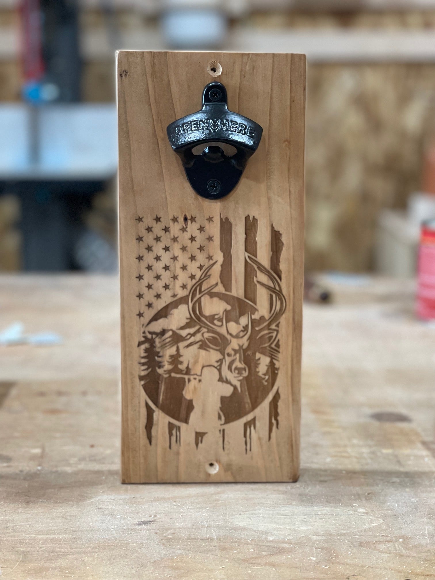 These bottle openers are made from abundant pine woods, and each one is laser engraved, assembled, stained and sanded by Alex directly here in West Haven, UT.