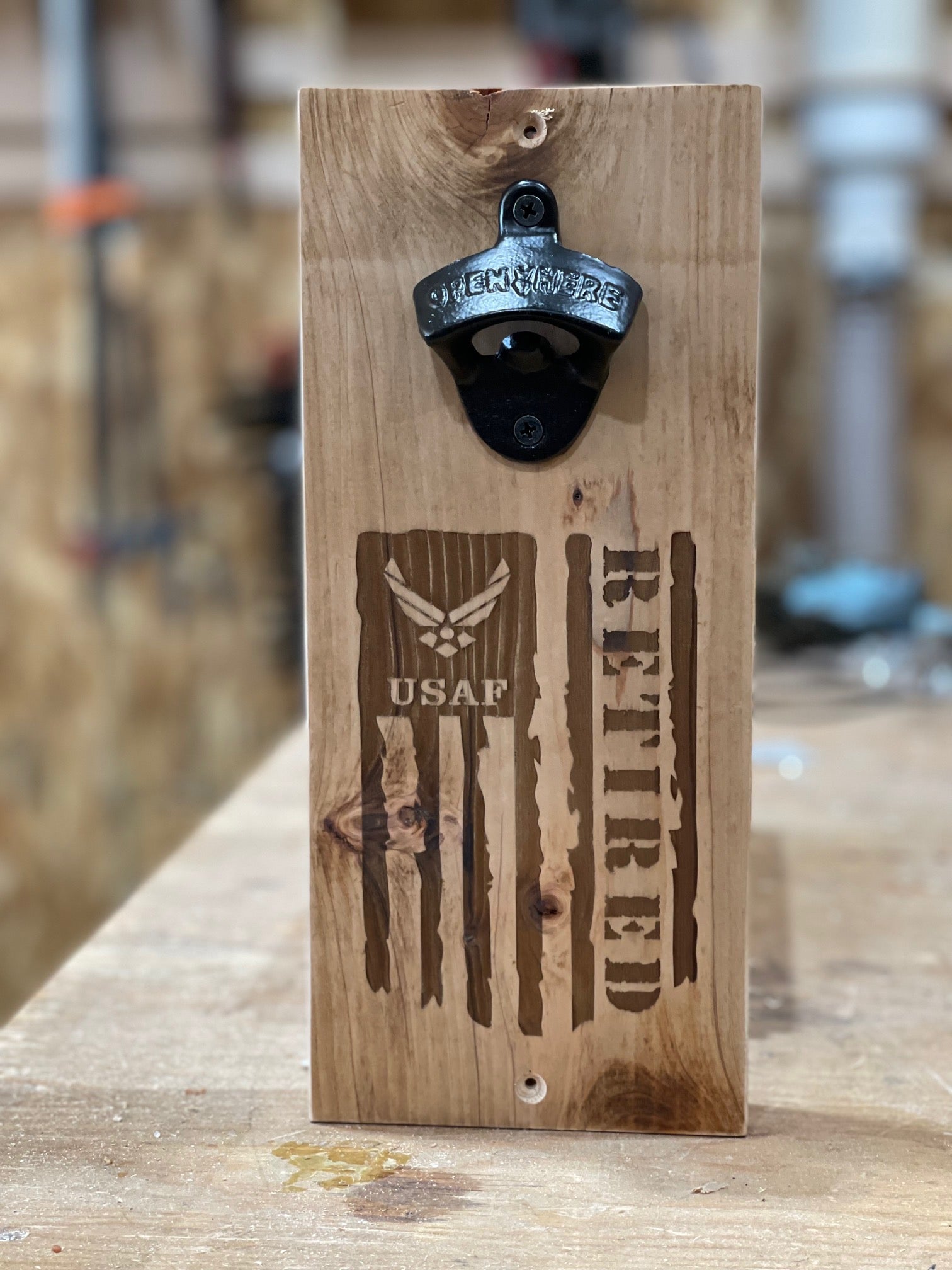 These bottle openers are made from abundant pine woods, and each one is laser engraved, assembled, stained and sanded by Alex directly here in West Haven, UT.